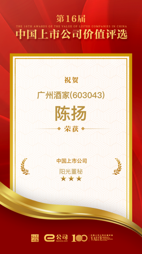 近日,由《证券时报》主办的第十六届中国上市公司价值评选获奖名单揭晓,广州酒家集团被评为“主板上市公司价值100强”。同时,集团党委书记、董事长徐伟兵被评为“年度领军人物”,董事会秘书陈扬被评为“阳光董秘”。