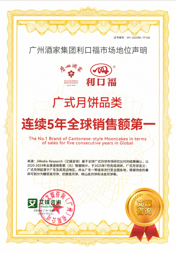 近日,全球知名新经济产业第三方数据挖掘和分析机构iiMedia Research(艾媒咨询)发布全球市场调研报告,广州酒家广式月饼品类销售额连续5年全球第一。这一成绩不仅印证了广式月饼作为中华美食文化名片的国际影响力,也凸显出广州酒家集团以匠心技艺、创新理念和卓越品质赢得全球消费者信赖的综合实力。