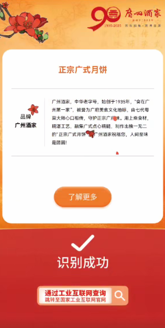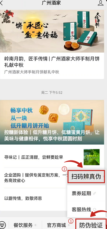 消费者可通过“广州酒家”公众号(认证主体:广州酒家集团股份有限公司)扫码辨真伪,具体操作流程如下: