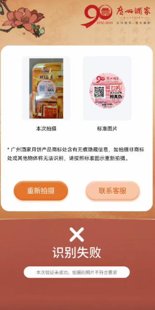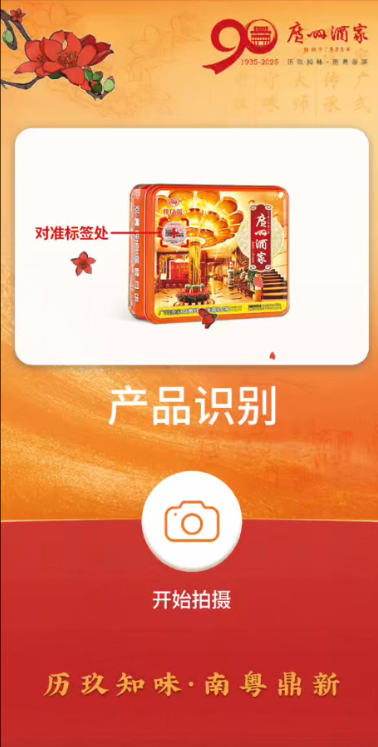 用户使用“微信扫一扫”扫描防伪二维码,跳转至“广州酒家”官方公众号-“防伪验证”。“②扫码辨真伪”。“开始拍摄”再次扫描防伪二维码。