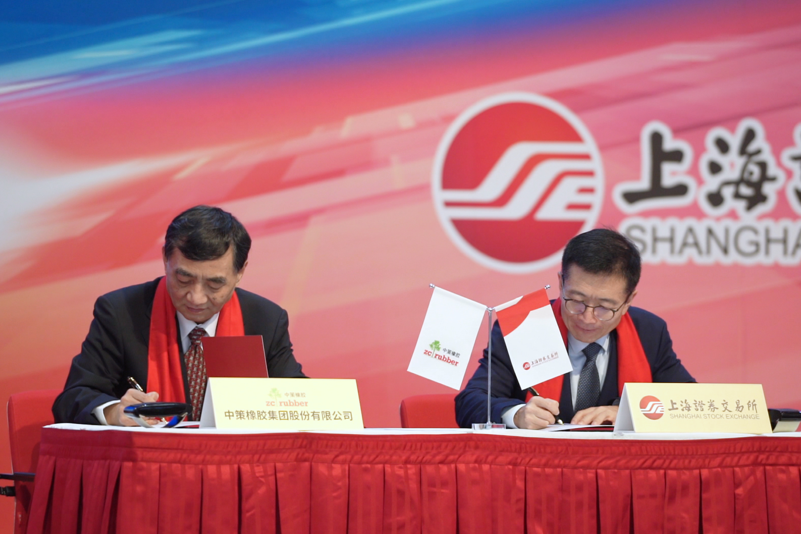 在上市仪式现场,上海证券交易所数字化专业委员会副主任兼技术公司董事长张晓京与中策橡胶党委书记、董事长沈金荣签订了《证券上市协议》。