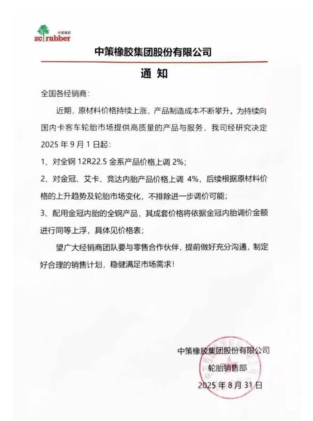 九月份,中策橡胶先后两次涨价,分别于9月1日及9月16日起,对旗下全钢轮胎、内胎及实心胎等多款产品进行2%至4%不等的价格上调。