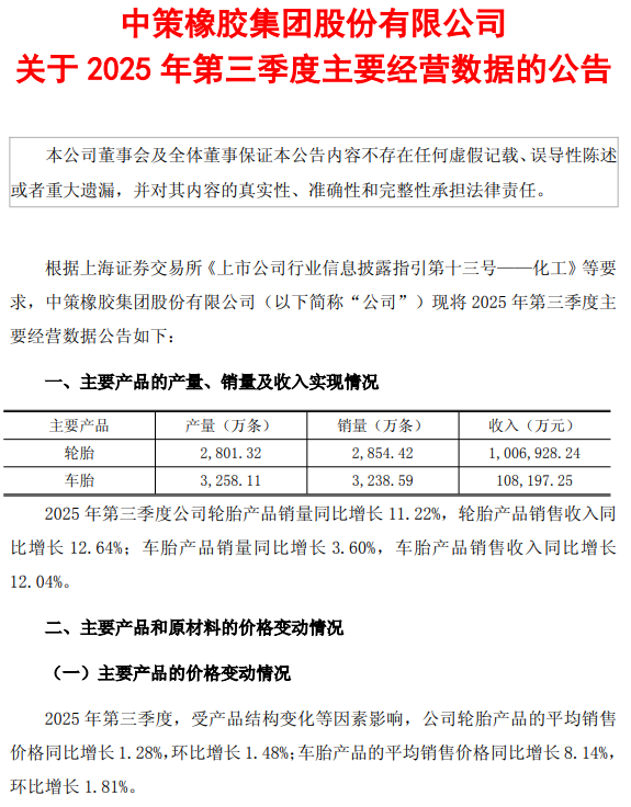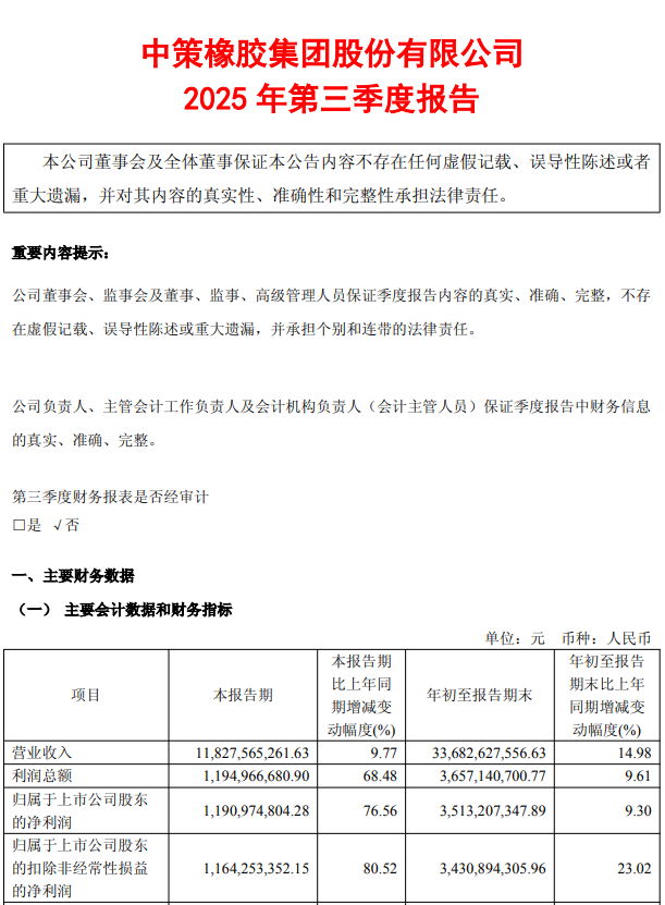 2025年10月20日,中国轮胎行业的绝对龙头——中策橡胶集团股份有限公司(证券代码:603049)发布了2025年第三季度报告。财报数据显示,公司在营收和利润上均实现了稳健增长,尤其是第三季度单季的净利润同比增幅高达76.56%,再次彰显了其作为行业领军者的卓越实力。