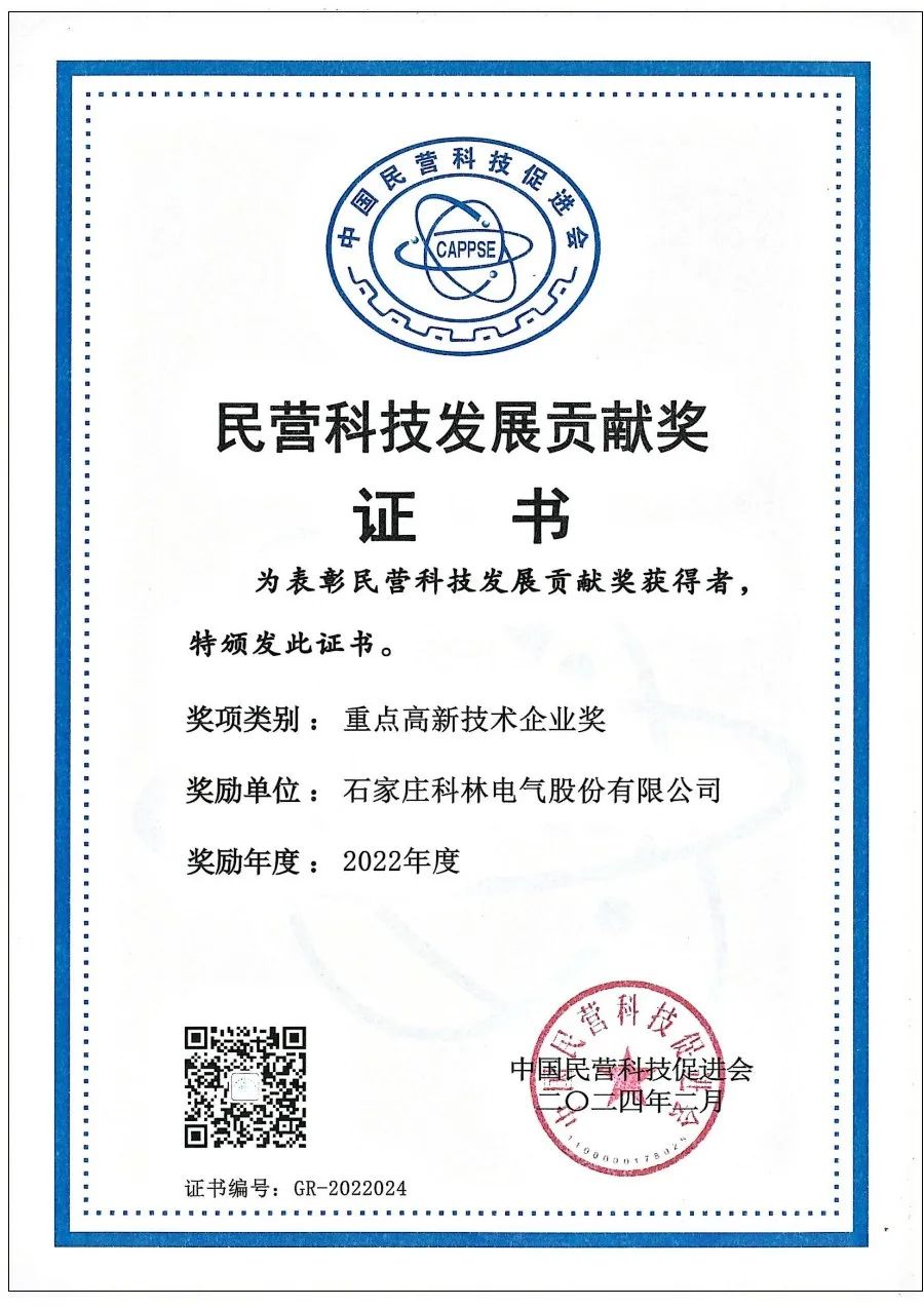 近日,中国民营科技促进会发布了“民营科技发展贡献奖”获奖名单,石家庄科林电气股份有限公司榜上有名,荣获“中国民营科技发展贡献奖”殊荣,这是对公司长期坚持自主创新、持续推动科技进步所取得成就的权威认可。