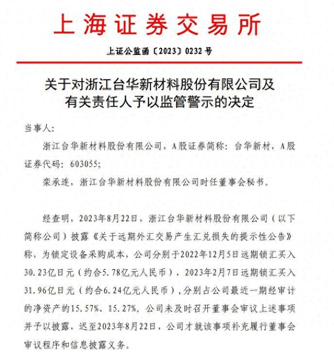 据《监管警示》,经查明,2023年8月22日,台华新材披露《关于远期外汇交易产生汇兑损失的提示性公告》(下称《汇兑损失公告》)称,为锁定设备采购成本,公司分别于2022年12月5日远期锁汇买入30.23亿日元,2023年2月7日远期锁汇买入31.96亿日元,分别占公司最近一期经审计的净资产的15.57%、15.27%。公司未及时召开董事会审议上述事项并予以披露,迟至2023年8月22日,公司才就该事项补充履行董事会审议程序和信息披露义务。