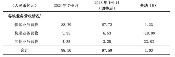 这一调整使得德邦股份的营收结构发生变化,快运业务在总营收中的占比显著提升。公司快运业务的表现在Q3并不算亮眼,实现营收为88.79亿元,同比微增1.23%,占营收的比重高达9成;快递业务实现营业收入为5.35亿元,同比减少18%;其他业务营业收入为4.35亿元,同比增长33.82%。