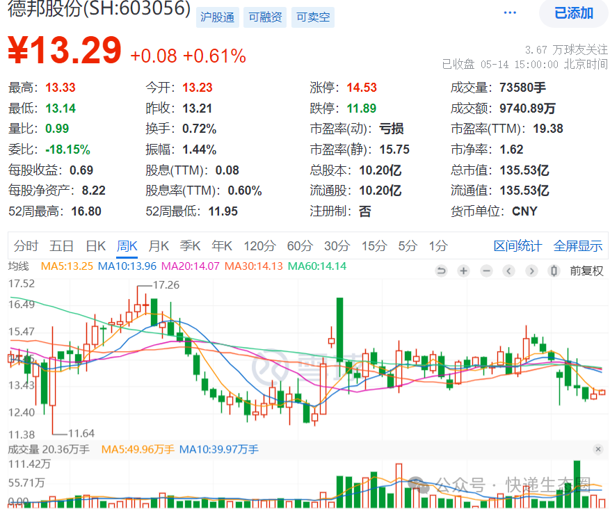 5月14日,德邦股份公告,披露其间接控股股东权益变动触及1%刻度的提示性公告。