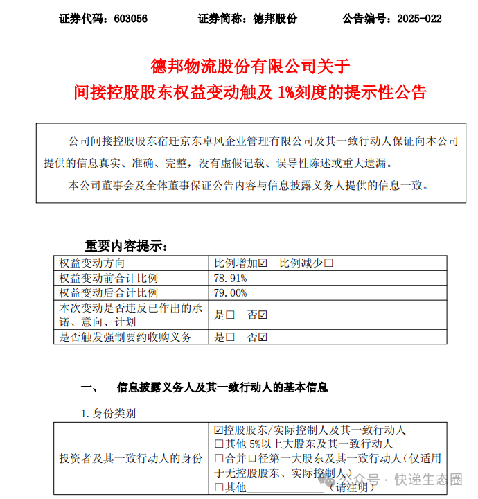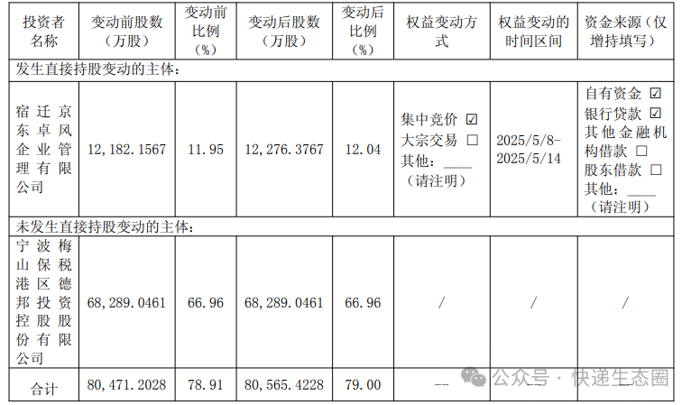 公告显示,德邦股份的间接控股股东宿迁京东卓风企业管理有限公司(以下简称“京东卓风”)及其一致行动人宁波梅山保税港区德邦投资控股股份有限公司(以下简称“德邦投资控股”)的持股比例由78.91%增加至79.00%。具体来看,京东卓风的持股数量从1.22亿股增加至1.23亿股,占比从11.95%增加至12.04%,变动方式为集中竞价,变动时间区间为2025年5月8日至2025年5月14日,资金来源为自有资金。