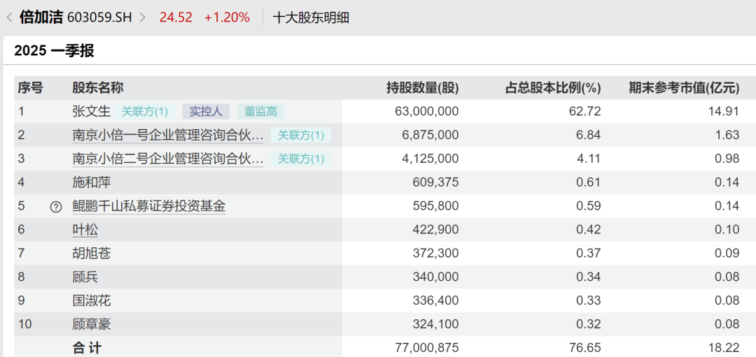 而就在三个月前,“南京小倍一号”、“南京小倍二号”、以及倍加洁部分高管刚刚完成一轮减持,合计减持约102万股,占总股本比例约1.01%,对应套现约2602万元。