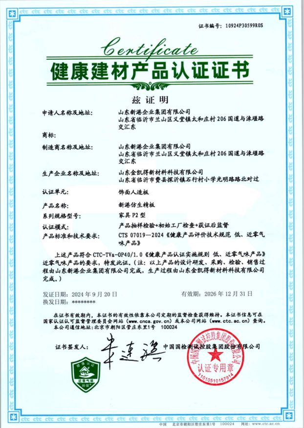 近日,国检集团为山东新港企业集团有限公司颁发了首张近零气味健康产品认证证书。