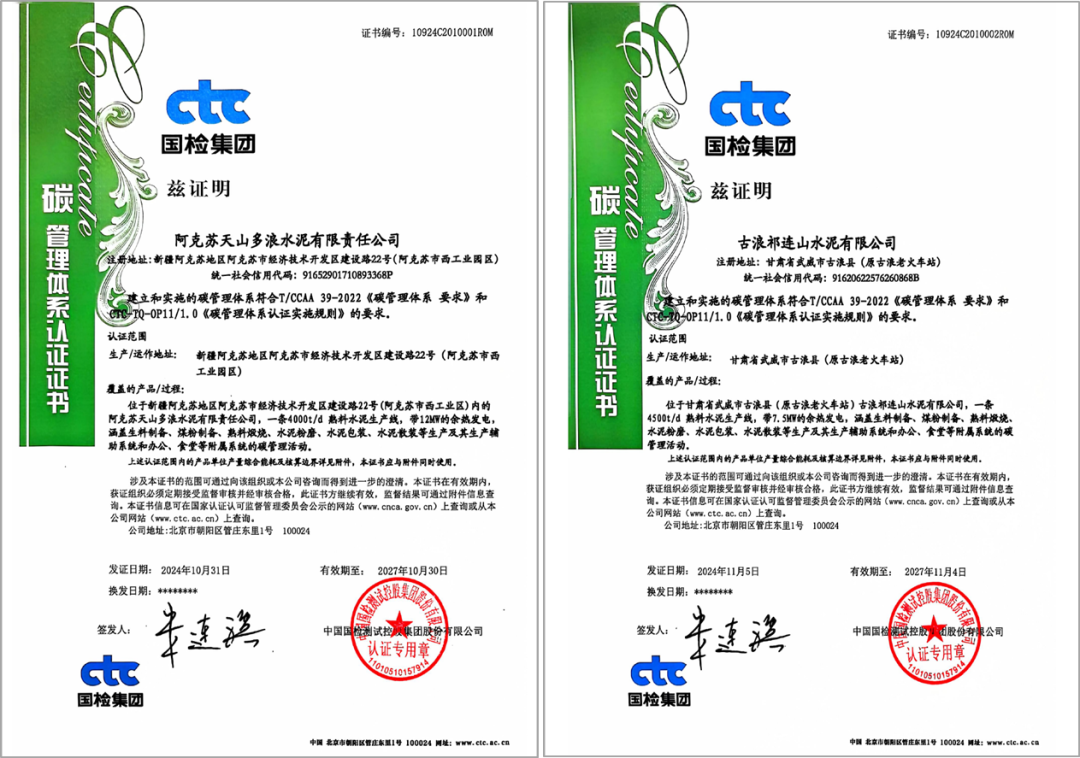 近日,国检集团为天山材料股份有限公司所属阿克苏天山多浪水泥有限责任公司和古浪祁连山水泥有限公司颁发了水泥行业首批碳管理体系认证证书。这是国检集团继低碳产品认证、温室气体核查、产品碳足迹核查之后,在涉碳领域的又一次重要突破,标志着国检集团在涉碳领域的研究和认证评价业务工作取得了阶段性成果。