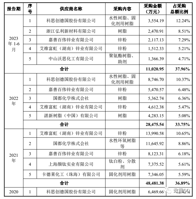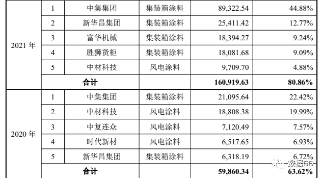 行人风电涂料收入、集装箱涂料收入占比合计均在95%以上,公司下游客户行业集中度较高。报告期内,公司向前五大客户的销售收入占营业收入的比例分别为63.62%、80.86%、67.10%和52.96%,下游行业的集中度较高导致公司的客户集中度也较高。