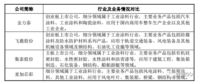 公司最终选取的可比上市公司为“(C26)化学原料和化学制品制造业”下属于“工业涂料”领域的全部A股上市公司,具体包括东来技术、金力泰、飞鹿股份和集泰股份。可比公司与发行人的情况对比如下: