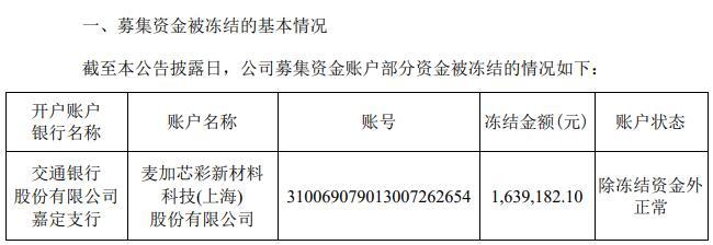 1月22日晚间,麦加芯彩(SH603062,股价47.40元,市值51.19亿元)公告称,于2024年1月22日查询公司交通银行股份有限公司嘉定支行募集资金账户,发现一账户可用余额与余额不一致。经与银行核实,公司开设的该募集资金专项账户中有163.92万元被宁波市北仑区人民法院以财产保全的名义冻结。