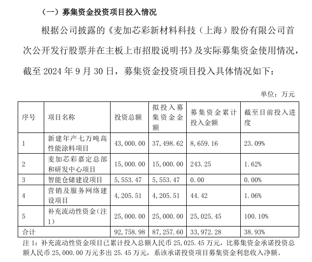 截至2024年9月30日,公司在“新建年产七万吨高性能涂料项目”中累计投入金额为8659万元,进度为23.09%;“麦加芯彩嘉定总部和研发中心项目”累计投入243万元,进度为1.62%;“智能仓储建设项目”尚未投入;“营销及服务网络建设项目”累计投入44万元,进度为1.06%;“补充流动性资金”项目已累计投入2.5亿元。