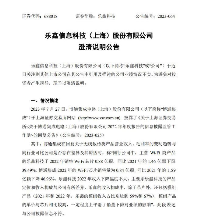 乐鑫科技称,根据公司披露的《2021年年度报告》及《2022年年度报告》,公司2022年销售Wi-Fi芯片1.65亿颗,同比2021年的2.26亿颗下降27.00%,并非博通集成公告中描述的“乐鑫科技于2022年销售Wi-Fi芯片0.88亿颗,同比2021年的1.46亿颗下降 39.49%”。此描述可能误导投资者以为乐鑫科技的Wi-Fi芯片销售量低于博通集成。
