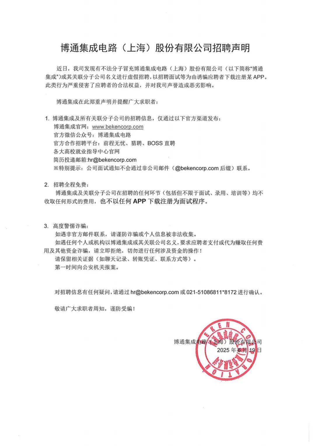 博通集成电路(上海)股份有限公司招聘声明