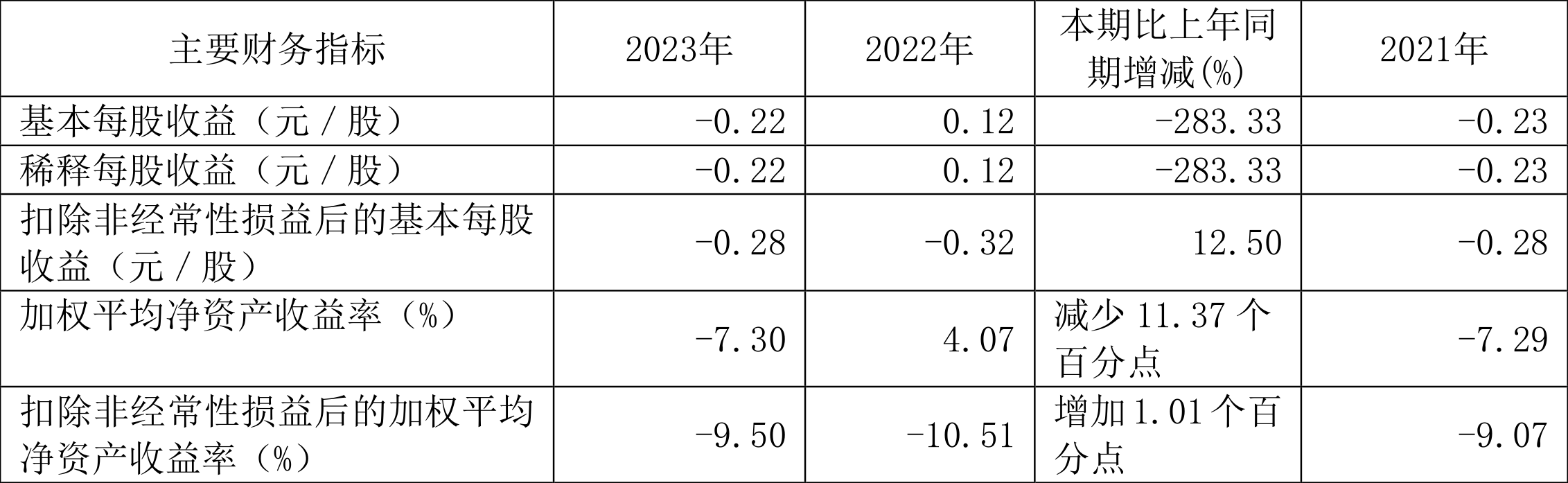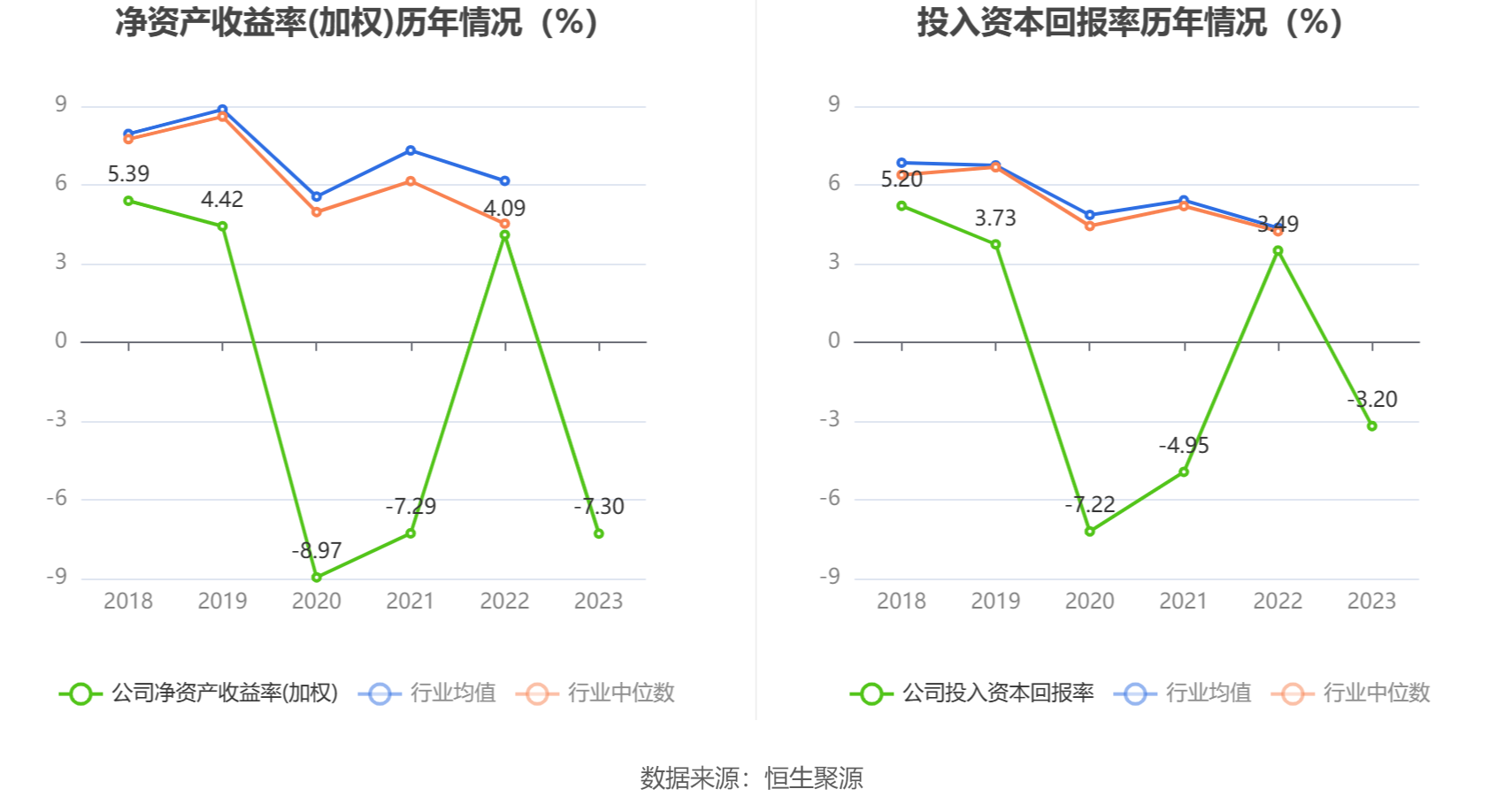 数据显示,2023年公司加权平均净资产收益率为-7.30%,较上年同期下降11.39个百分点;公司2023年投入资本回报率为-3.20%,较上年同期下降6.69个百分点。