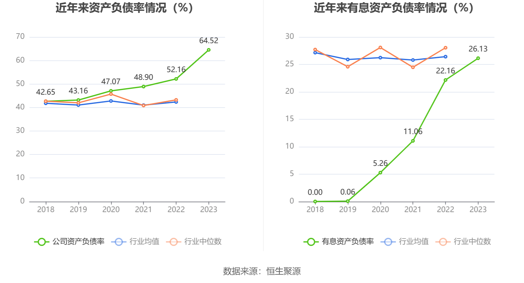 在偿债能力方面,公司2023年年末资产负债率为64.52%,相比上年末上升12.36个百分点;有息资产负债率为26.13%,相比上年末上升3.97个百分点。