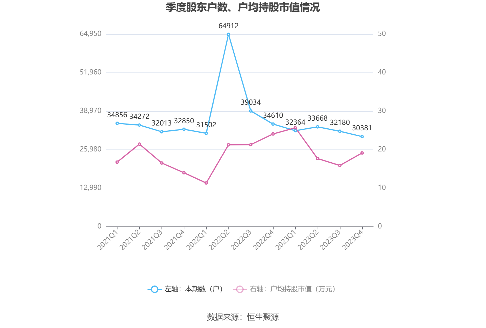 筹码集中度方面,截至2023年年末,公司股东总户数为3.04万户,较三季度末下降了1799户,降幅5.59%;户均持股市值由三季度末的15.87万元上升至19.14万元,增幅为20.60%。