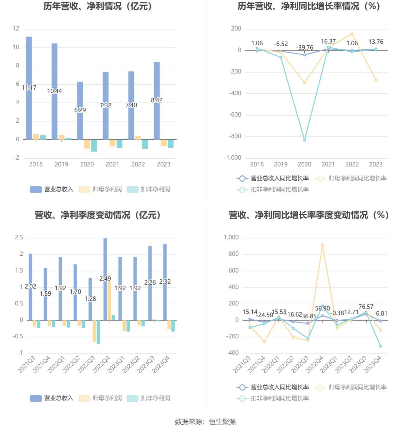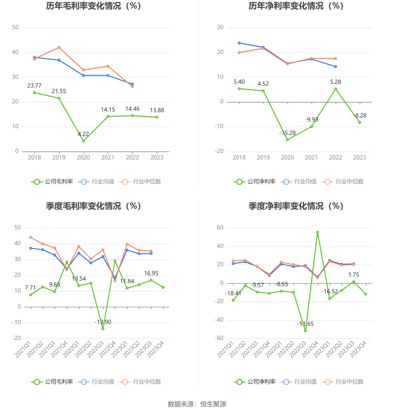 2023年,公司毛利率为13.88%,同比下降0.58个百分点;净利率为-8.28%,较上年同期下降13.56个百分点。从单季度指标来看,2023年第四季度公司毛利率为12.43%,同比下降16.84个百分点,环比下降4.52个百分点;净利率为-11.77%,较上年同期下降67.16个百分点,较上一季度下降13.52个百分点。