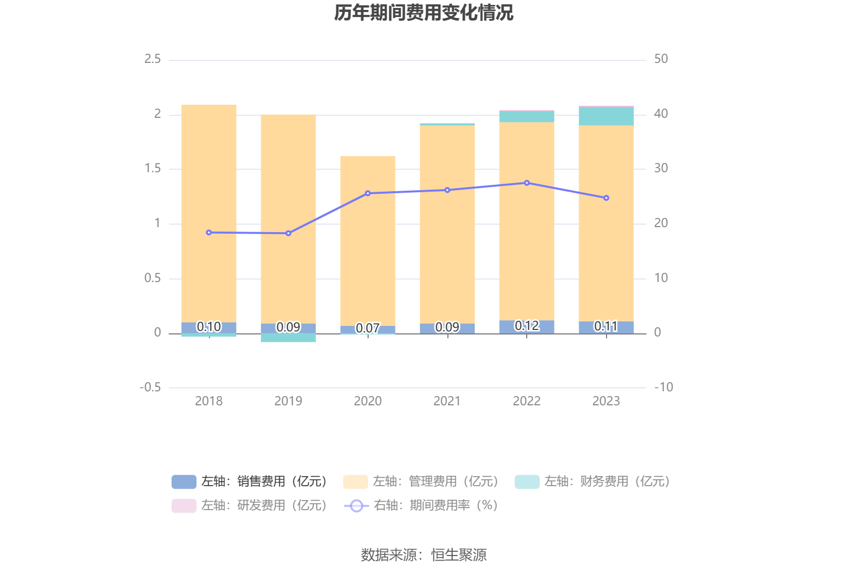 2023年,公司期间费用为2.08亿元,较上年同期增加475.64万元;但期间费用率为24.76%,较上年同期下降2.76个百分点。其中,销售费用同比下降2.54%,管理费用同比下降1.29%,研发费用同比下降17.19%,财务费用同比增长78.01%。