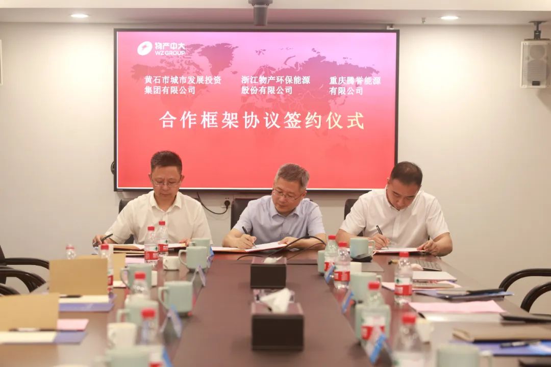 7月10日下午,物产环能与黄石城发集团、重庆腾誉能源在杭州签署合作框架协议。物产环能党委书记、董事长陈明晖,党委副书记、副董事长、总经理黎曦,党委委员、副总经理林开杰,党委委员、副总经理、董事会秘书王竹青,黄石城发集团党委书记、董事长程正栋,党委委员、总经济师林云,鄂东物产党总支书记、董事长李晨,重庆腾誉能源董事王猛等领导出席签约仪式。