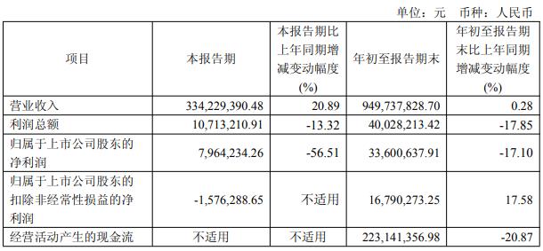 年初至报告期末,公司实现营业总收入9.50亿元,同比增长0.28%;实现归属于母公司所有者的净利润3360.06万元,同比减少17.10%;实现归属于母公司所有者的扣除非经常性损益的净利润1679.03万元,同比增长17.58%,经营活动产生的现金流净额为2.23亿元,同比减少20.87%。