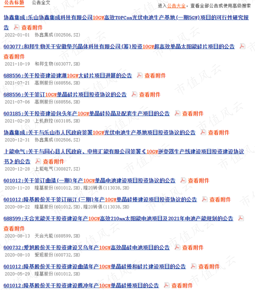 并且,目前光伏行业竞争激烈,很多企业陆续推出了规模庞大的产能扩张计划。风云君随手在Choice金融终端一搜,相关上市公司的投资项目多数都是10GW起步。