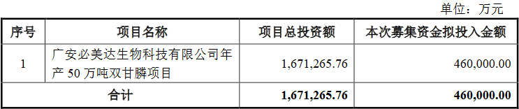和邦生物本次可转债的发行规模不超过460,000.00万元(含),扣除发行费用后,募集资金净额将全部用于广安必美达生物科技有限公司年产50万吨双甘膦项目。