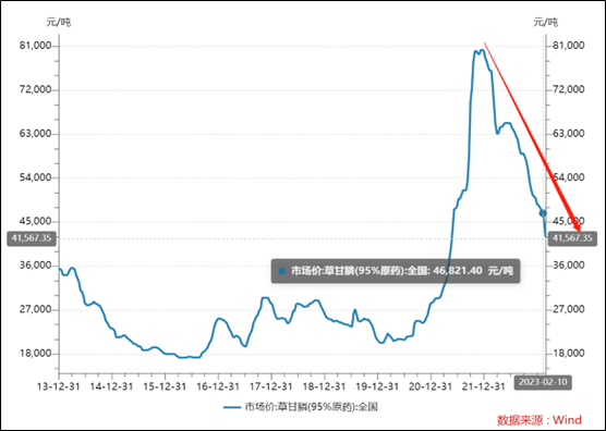 首先,从短期价格走势看,自2021年12月底,草甘膦价格已经出现拐点,去年年初至今,其价格从8万元/吨下降至4万元/吨左右,价格跌幅接近腰斩。根据相关业内人士预估,2023年草甘膦价格大概率将回落至35000-40000元/吨。需要指出的是,双甘膦为草甘膦中间体,其市场价格走势与草甘膦基本一致。需要强调的是,这块业务为和邦生物贡献半壁江山,其未来业绩压力可想而知。