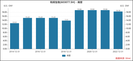 需要指出的是,公司的并购标的业绩并不稳定。和邦农科生产业务形成产品草甘膦及双甘膦,前文已经指出,其产品呈现较强的周期性。和邦农科为和邦生物贡献了公司营收的半壁江山,在2014-2016年勉强完成业绩承诺任务后,2020年曾一度出现亏损,直至近年该行业景气度回归才使得业绩大幅反转。值得一提的是,和邦农科目前对应的商誉超12亿元。