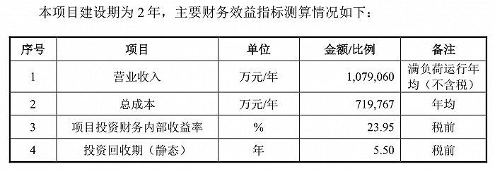 据悉,通过该项目的实施,和邦生物拟建设50万吨/年双甘膦产品生产线,主要包括:30万吨/年亚氨基二乙腈、84万吨/年甲醛、25万吨/年亚磷酸、30万吨/年连续转化合成氨、36万吨/年废盐综合利用离子膜烧碱装置及相关公辅设施、配套工程,配套建设绿色环保综合循环利用回收装置。项目建设期为2年,根据预测,项目的财务效益指标:营业收入107.906亿元/年(满负荷运行年均),总成本71.9767亿元/年,项目投资财务内部收益率23.95%,投资回收期(静态)5.5年。
