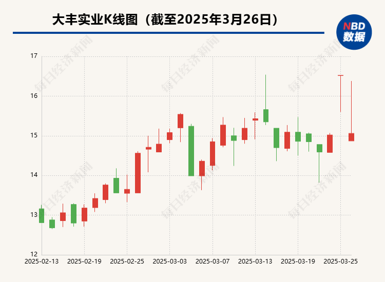 在大丰实业宣布与智元机器人合作后,公司股票在3月25日涨停,收于16.52元/股,换手率达18.48%。但在26日,公司股价以跌停价开盘,收于14.87元/股。