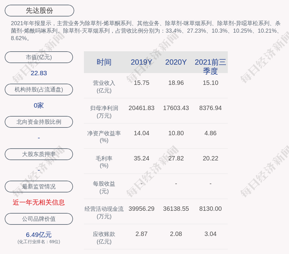 2021年年报显示,先达股份的主营业务为除草剂-烯草酮系列、其他业务、除草剂-咪草烟系列、除草剂-异噁草松系列、杀菌剂-烯酰吗啉系列、除草剂-灭草烟系列,占营收比例分别为:33.4%、27.23%、10.3%、10.25%、10.21%、8.62%。