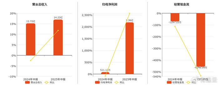 公司营业总收入为14.23亿元。归母净利润为1.36亿元。经营活动现金净流入为-8246.09万元,较去年同报告期经营活动现金净流入减少6948.87万元。