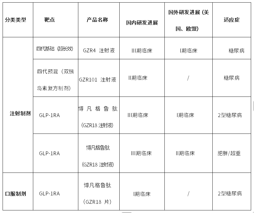 公司产品管线中,多个 1.1 类创新产品处于临床开发阶段,包括用于糖尿病和肥胖/超重的 GLP-1 受体激动剂双周制剂博凡格鲁肽(GZR18注射液)、胰岛素周制剂GZR4和预混双胰岛素类似物GZR101注射液等产品研发进度处于国内同品种领先水平,三者均是全球内分泌领域新药研发的热点方向。诺和诺德及礼来是全球市场研发同类产品的主要公司,目前两家公司的市值截止至1月9日收盘时,分别为3804亿美元及7473亿美元。