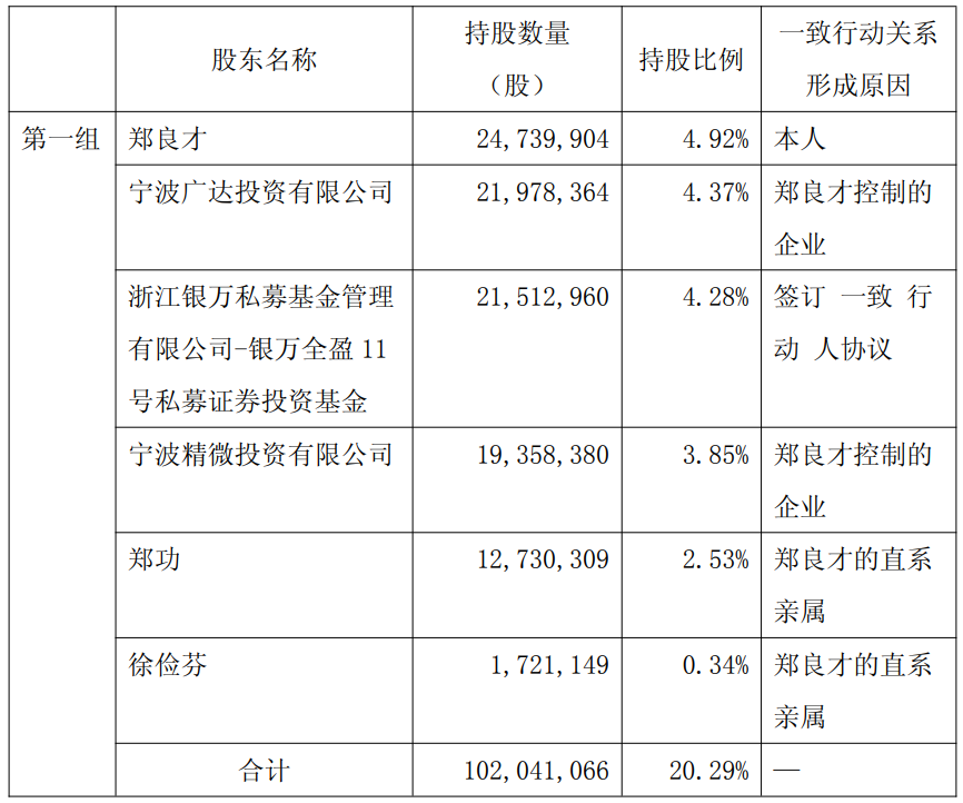 公告显示,广达投资、精微投资为郑良才控制的企业,郑功为郑良才之子,徐俭芬为郑良才配偶。浙江银万私募基金管理有限公司-银万全盈11号私募证券投资基金为郑良才、郑功、徐俭芬一致行动人。
