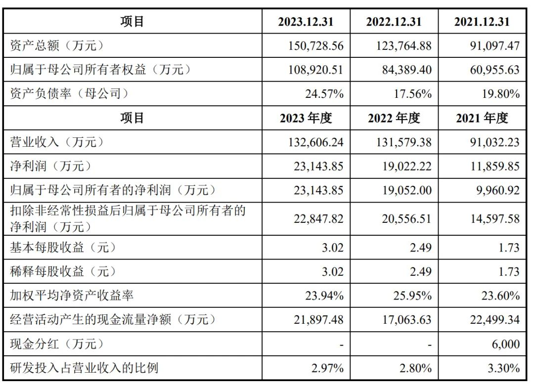 招股书显示,众鑫股份2021年、2022年、2023年营收分别为9.1亿元、13.2亿元、13.26亿元;净利分别为1.19亿元、1.9亿元、2.31亿元;扣非后净利分别为1.46亿元、2.06亿元、2.28亿元。
