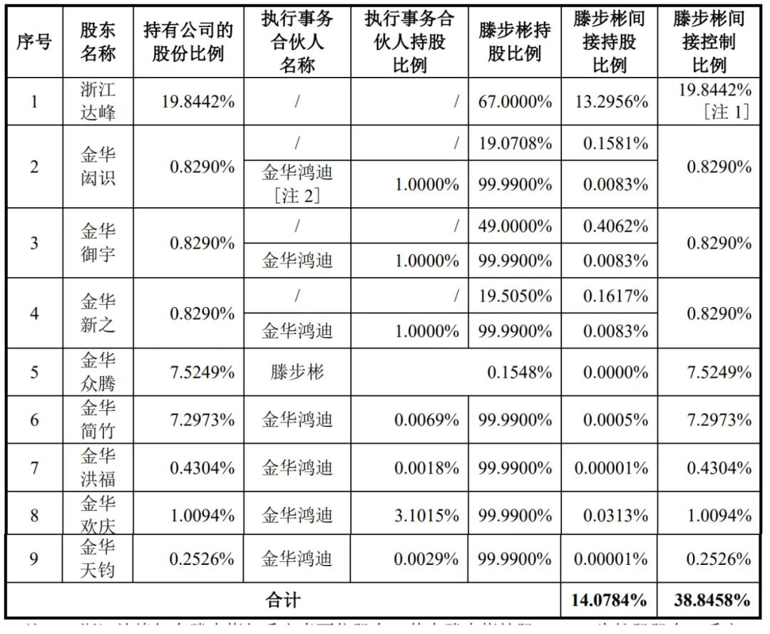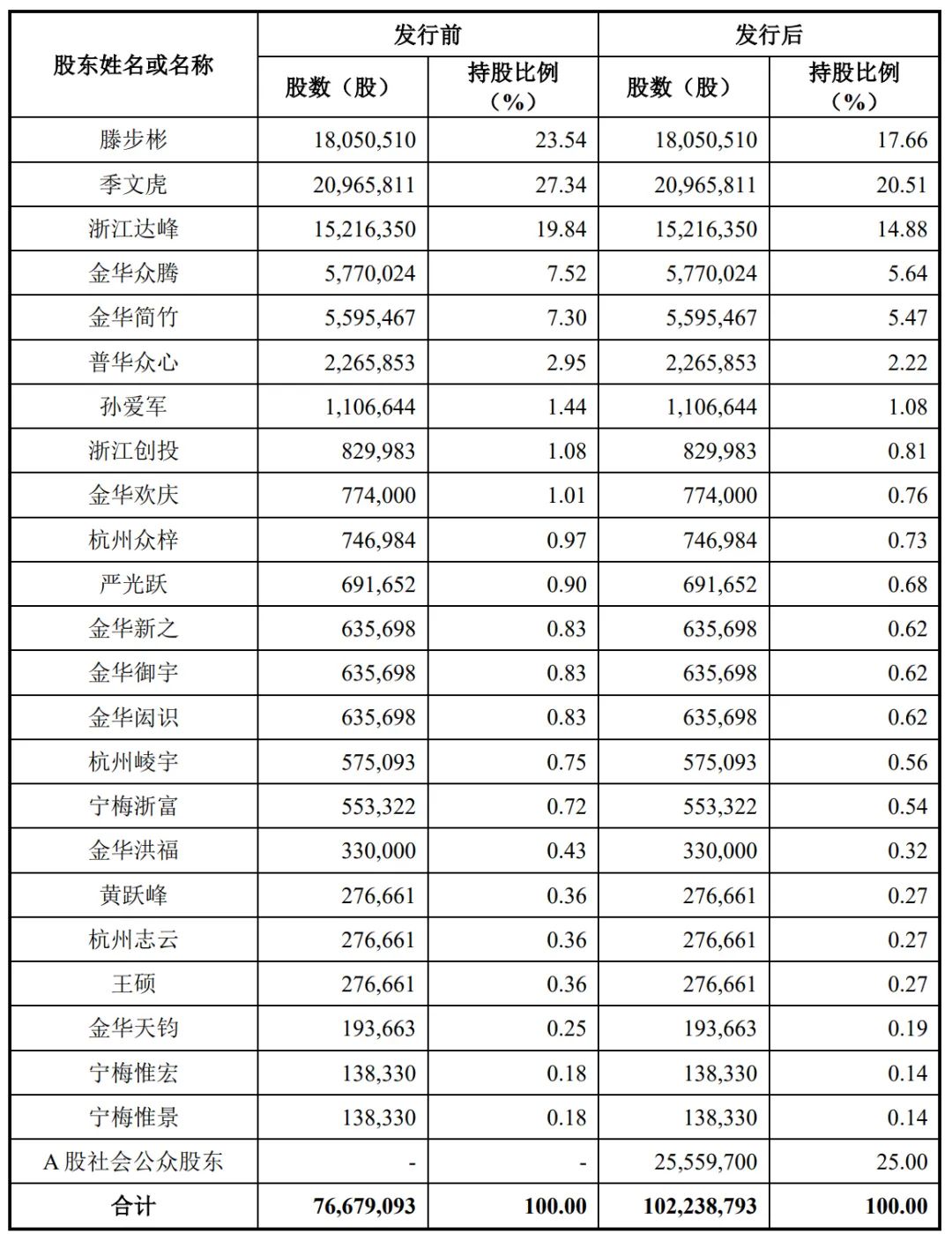 IPO后,滕步彬直接持股为17.66%,季文虎持股为20.51%,浙江达峰持股为14.88%,金华众腾持股为5.64%,金华简竹持股为5.47%,普华众心持股为2.22%,孙爱军持股为1.08%,浙江创投持股为0.81%,金华欢庆持股为0.76%,杭州众梓持股为0.73%;
