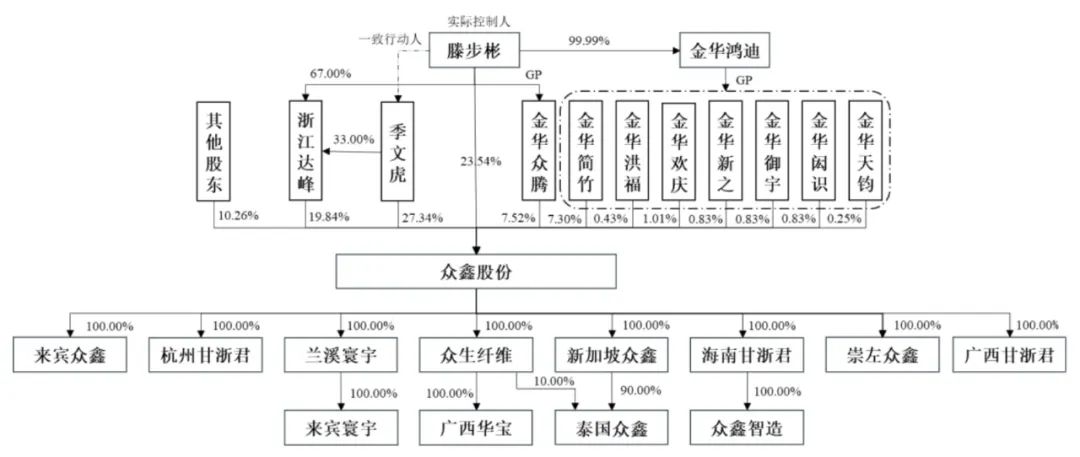 IPO前,滕步彬直接持有公司23.5403%的股份,间接持有公司14.0784%的股份,通过控制浙江达峰、金华闳识、金华众腾、金华御宇、金华新之、金华简竹、金华欢庆、金华洪福、金华天钧间接控制公司38.8458%的股权,故其通过直接及间接方式合计控制公司62.3861%的股权;滕步彬的一致行动人季文虎直接持有众鑫股份27.3423%股权。