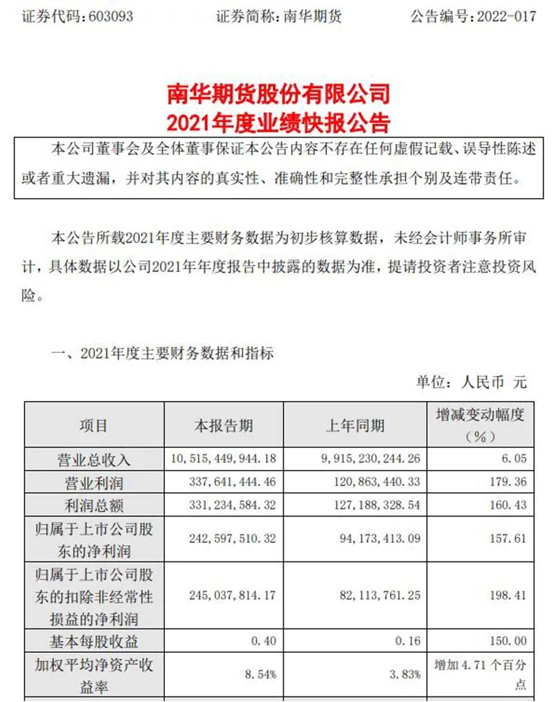 与之形成鲜明对比的是,A股上市公司南华期货2月14日盘后披露2021年度业绩快报:2021年全年,公司实现营业利润人民币3.38亿元,利润总额人民币3.31亿元,实现归属于上市公司股东的净利润人民币2.43亿元,分别较上年同期增长179.36%、160.43%和157.61%。