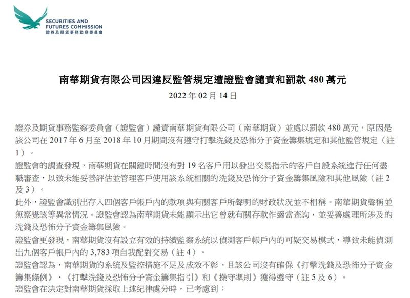 记者关注到,2月14日,有媒体引述香港证监会消息称:“经调查,南华期货在2017年6月至2018年10月期间没有遵守打击洗钱及恐怖分子资金筹集规定和其他监管规定……香港证监会认为,南华期货的系统及监控措施不足及成效不彰,谴责南华期货并处以罚款480万港元。”