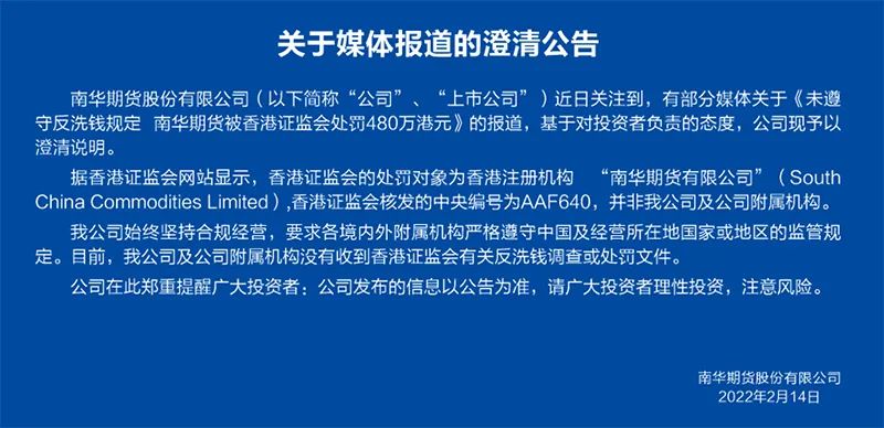 2月14日,A股上市公司南华期货在官网首页发布公告,对部分媒体报道的《未遵守反洗钱规定南华期货被香港证监会处罚480万港元》的内容进行澄清。