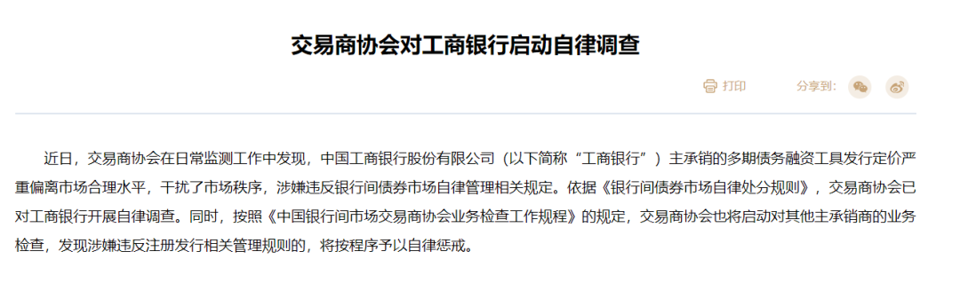 4月4日,交易商协会官方网站发布:交易商协会对工商银行启动自律调查。