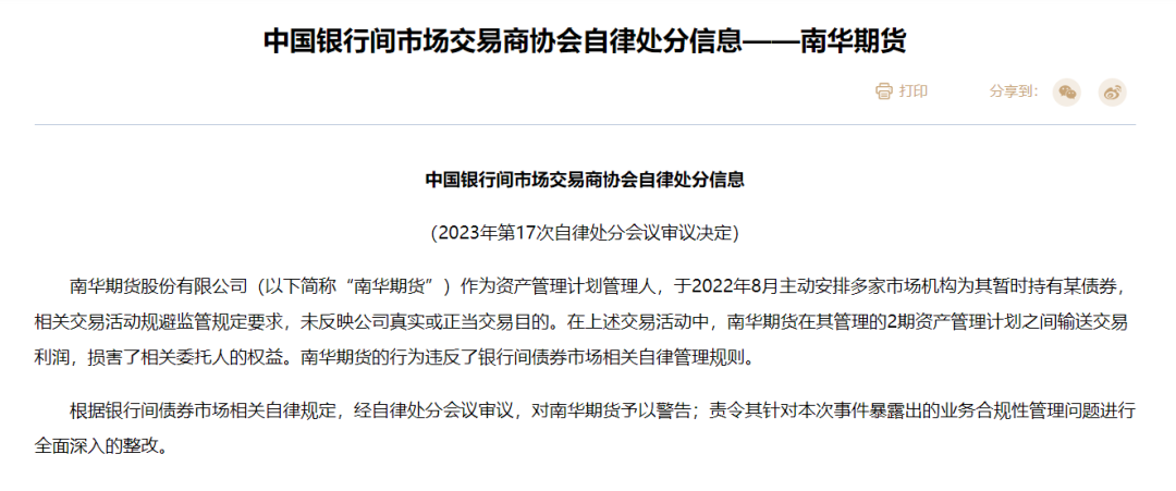 刚刚,银行间市场交易商协会网站披露针对南华期货的自律处分。