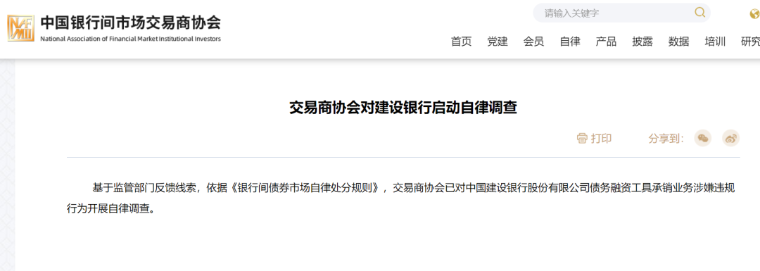 2023年5月11日,基于监管部门反馈线索,依据《银行间债券市场自律处分规则》,交易商协会已对中国建设银行股份有限公司债务融资工具承销业务涉嫌违规行为开展自律调查。