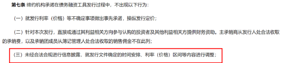 第七条明确规定,缔约机构不得出现”未经合法合规进行信息披露,就发行文件确定的时间安排、利率(价格)区间等内容进行调整“的行为,针对的就是不规范的簿记建档行为。