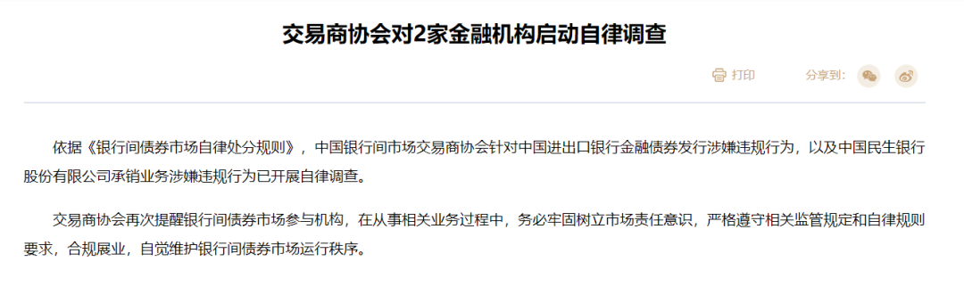 2023年5月9日,银行间市场交易商协会网站披露对中国进出口银行、中国民生银行股份有限公司启动自律调查。