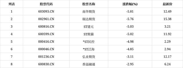 今日午盘,截至13:15,多元金融板块下挫。南华期货(603093.CN)跌5.81%报12.49元,瑞达期货(002961.CN)跌5.76%报15.38元,ST建元(600816.CN)跌5.03%报3.21元,ST熊猫(600599.CN)跌5.02%报11.92元,*ST民控(000416.CN)跌4.98%报2.29元,*ST泛海(000046.CN)跌4.85%报2.94元,弘业期货(001236.CN)跌3.11%报12.17元,香溢融通(600830.CN)跌2.95%报6.24元。